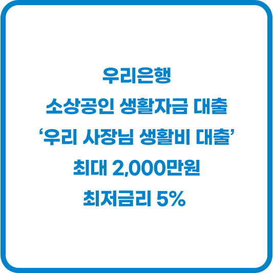 소상공인 생활자금 대출에 대해 알아보겠습니다. 우리은행 에서는 지난3월 발표된 '우리 상생금융 3.3 패키지' 사업의 하나로 '우리 사장님 생활비 대출'을 출시합니다. 경제적 어려움에 처한 소상공인에게 저금리로 생활안정 자금을 지원하기 위한 상품으로, 자격 및 대출조건은 다음과 같습니다.